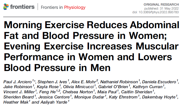 2022年5月31日,Frontiers in Physiology 期刊发表了一篇题为:Morning Exercise Reduces Abdominal Fat and Blood Pressure in Women; Evening Exercise Increases Muscular Performance in Women and Lowers Blood Pressure in Men 的接洽论文。